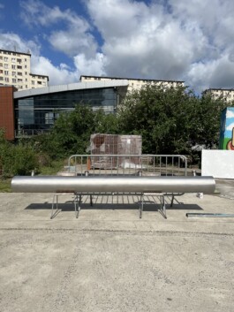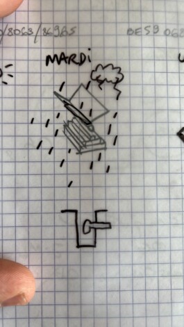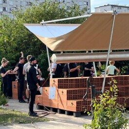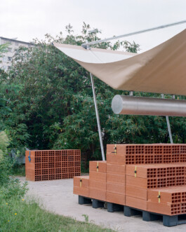 Le socle de notre pavillon est constitué de parpaing brique, un matériau de construction industriel de faible coût. Celui que nous avons choisi est perforé et présente l’avantage d’être léger et de laisser l’air circuler. Positionné le long des voies ferrées, la perforation accroît la performance du mobilier en rafraîchissant l’air qui s’engouffre à l’intérieur. Lorsque l’eau est libérée sur le socle, un effet rafraîchissant est ainsi créé sur commande sans qu’aucune source énergétique ne soit nécessaire pour que le système fonctionne. Le pavillon devient le nouveau régulateur thermique du lieu.