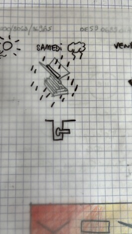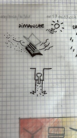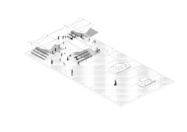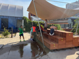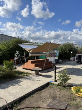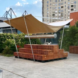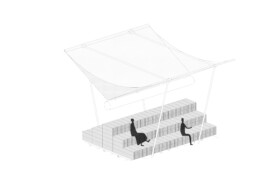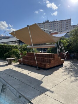 Prévu sur la dalle en béton, le pavillon propose un nouveau lieu ombragé et rafraichissant profitant à la fois des mouvements d’air et du paysage de friche. Il est imaginé modulable et facilement déplaçable afin d’évoluer au rythme du lieu. Il faut un jour et deux personnes pour le monter et le démonter. L’outillage nécessaire est rudimentaire. Les matériaux disponibles facilement dans les commerces alentours.
