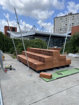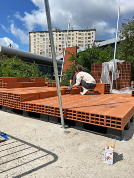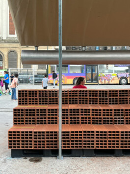La modularité de la brique permet aussi de faire varier les volumes et de créer diverses assises en fonction de leurs dispositions. La petite tribune devient un espace de jeu, d’attente ou de pause. Le poids du socle assure la stabilité de l’ensemble.