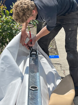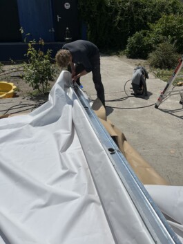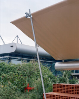 Le réservoir a la capacité de collecter jusque 260L d’eau de pluie. C’est lui qui leste la toile et génère les pentes. Un profil U est dissimulé côté intérieur de la toiture souple. Des jonctions ponctuelles permettent à la fois de supporter le réservoir mais aussi d’y acheminer l’eau captée. Un robinet permet aux utilisateurs de libérer eux-mêmes l’eau en fonction de la chaleur.